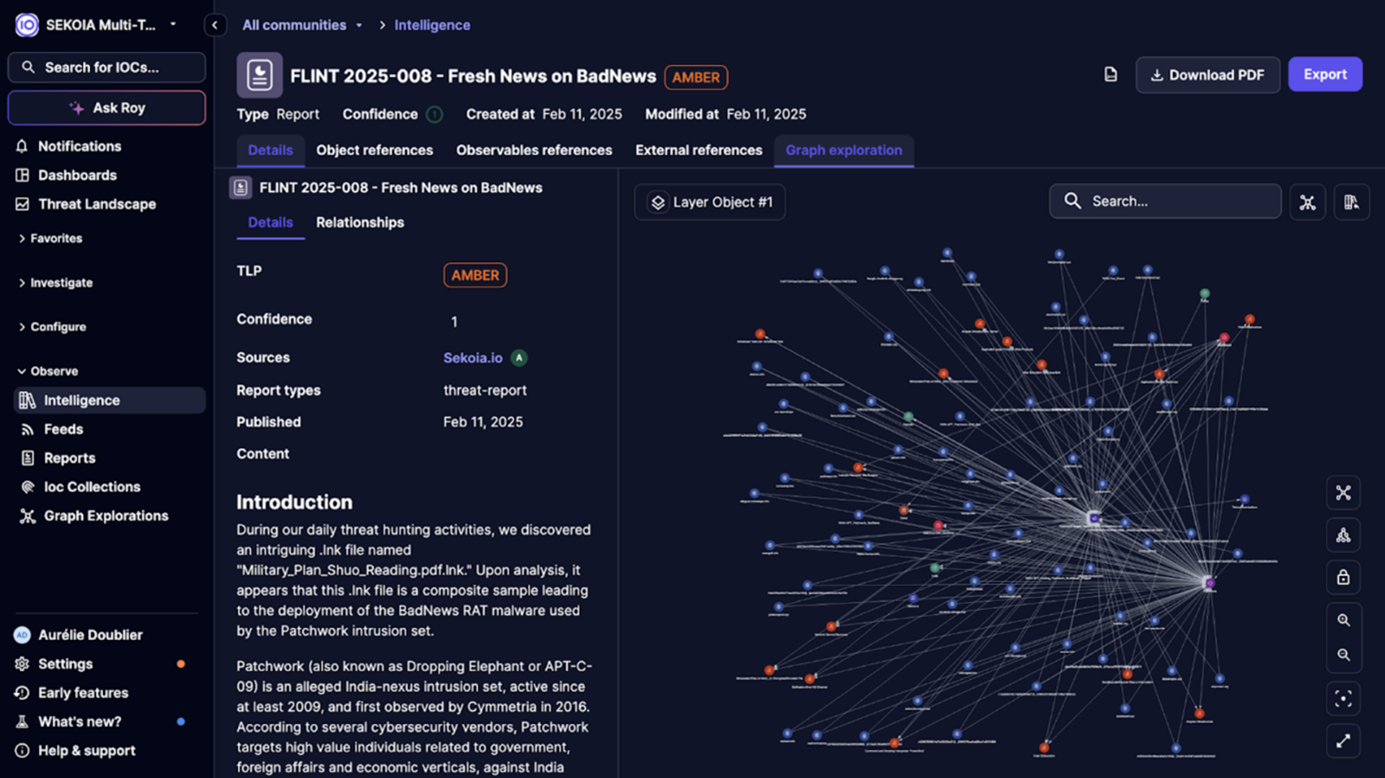 Sekoia wykorzystuje model grafowy oraz standardy takie jak STIX, umożliwiając eksplorację relacji między obiektami threat intelligence oraz ich operacyjne wykorzystanie w systemach bezpieczeństwa.